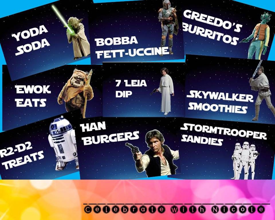 star wars food labels Archives - My Silly Squirts These Star Wars party food labels are out-of-this-world (pun intended). They're easy to print at home and add the perfect touch, worthy of any crazed fan. Check it out! 21 FREE Star Wars food labels for your next party. Continue reading "21 Yoda-riffic Star Wars party food labels (free)" 21 Yoda-riffic Star Wars party food labels (free) - My ... Here's the names of each of the labels and the food that goes with them: Leia's buns = cinnamon rolls Cloud City Cooler = water bottles Jakku Juice = Apple Juice Bb-ade = Gatorade Vaderade = Gatorade Palpatine's pizza bites = pizza bites Porg particles = chicken nuggets Yoda soda = any type of soda Sarlacc pit dig = bean dip with chips Star Wars Party Printables and Epic Ideas | All Things ... You can find a lot of great ideas here: Star Wars Party Favors . Decorations. Banner, Food Signs and Other Printables: Find everything you need in my FREE Printable Pack!! Light Saber Napkins: The wrapper for these is in my printable pack. Find the tutorial HERE; Store Bought Star Wars Party Accessories: Find them at Star Wars Party Supplies