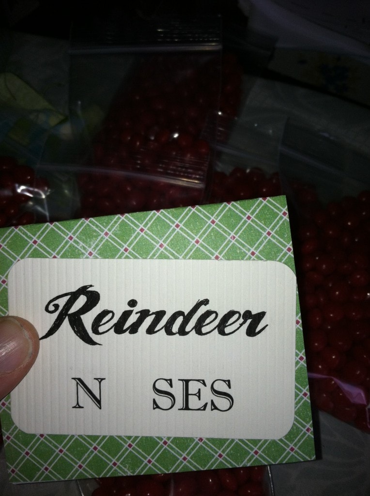 DIY Reindeer Noses Treat Bags with Free Printable Labels How to Make Reindeer Noses Treat Bags 1. Cut out the printables and fold in half. 2. Place brown candies in a treat bag or sandwich bag. Take a small handful of red candies and combine with brown candies in the treat bag. 3.